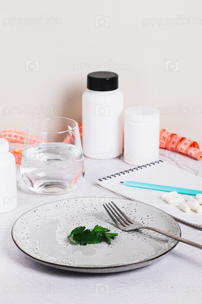 Листья петрушки и вилка на пустой тарелке, блокнот и капсулы на столе вертикальный вид