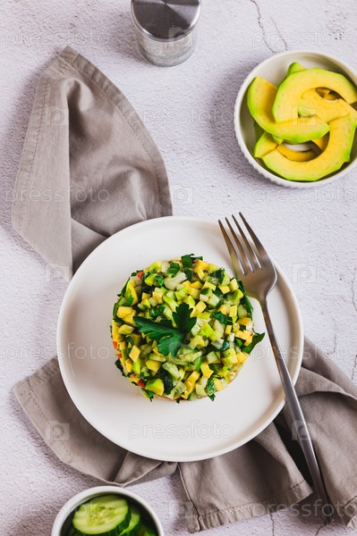 Пескетарианский салат со слегка подсоленным лососем, огурцом и авокадо на тарелке (вид сверху и снизу вверх)