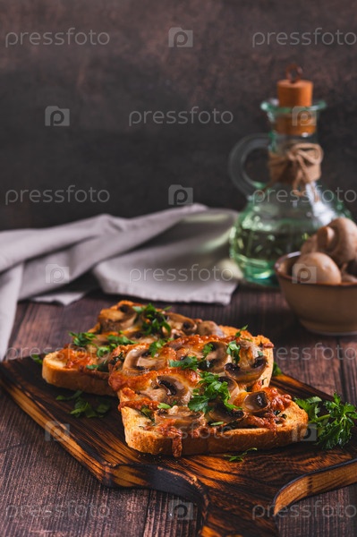 Вкусные выпеченные бутерброды с сыром, грибами и травами на доске вертикального вида
