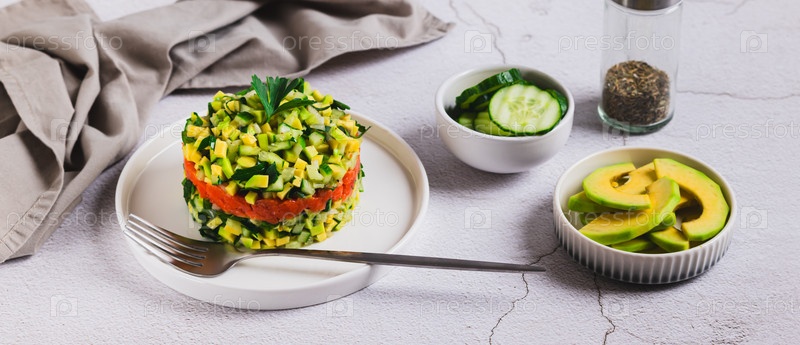 Диетический салат с авокадо, огурцом и красной рыбой на тарелке за столом