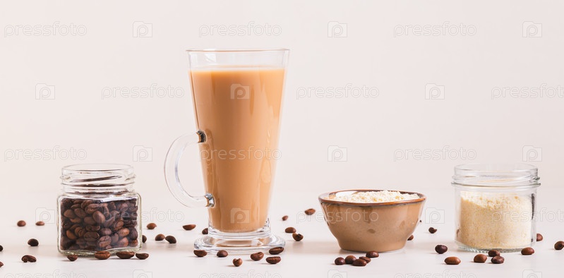 Белковый кофе в стакане и протеиновый порошок в миске на столе WEB баннер