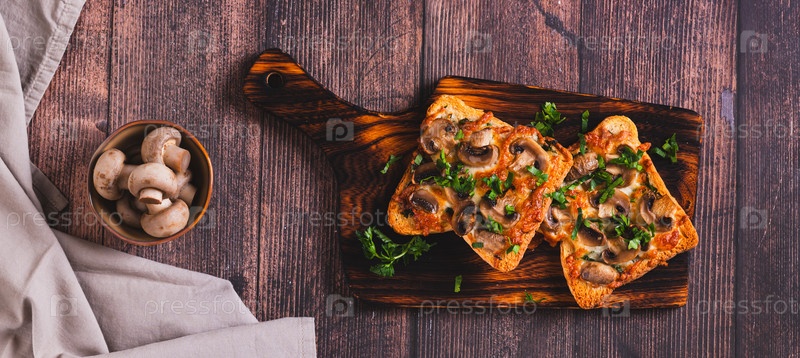 Горячие тосты с грибами, сыром и травами на доске на столе верхний вид веб-баннер