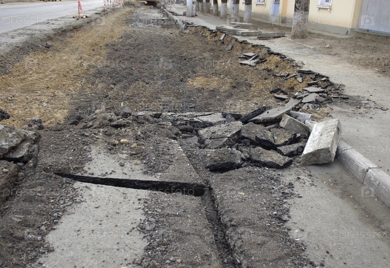 Сломанный асфальт, отсутствие заборов и предупреждающие знаки о ремонте на дороге. ремонт проезжей части после реконструкции городских улиц. дорога не пригодна для движения