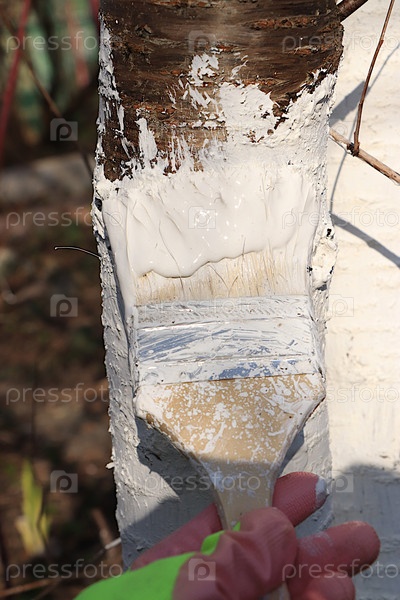 Окрашивание деревьев в саду белым известом ранней весной для защиты коры от жуков, муравьев и вредителей. Сезонные работы проводятся в апреле и в конце осени - ноябре