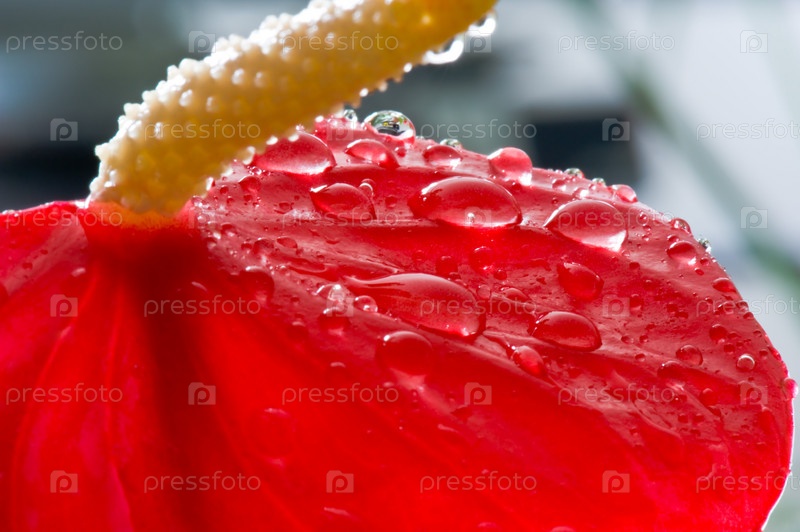 Капли росы на красном цветке крупным планом
