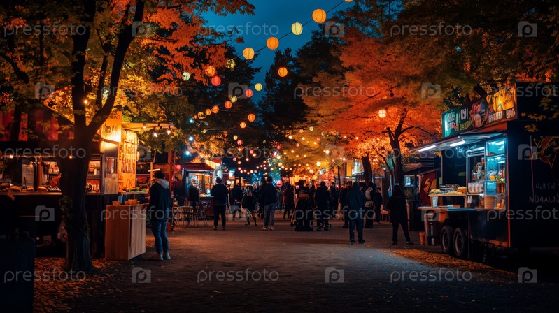 Вибрирующий ночной рынок со струнными огнями и торговыми киосками осенью