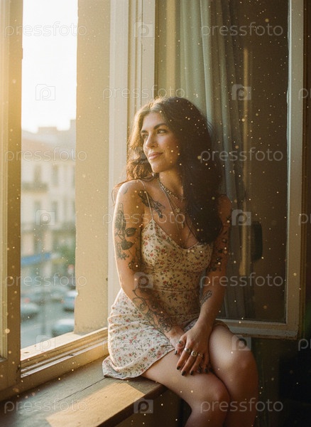 Девушка в летнем платье сидит у окна на закате