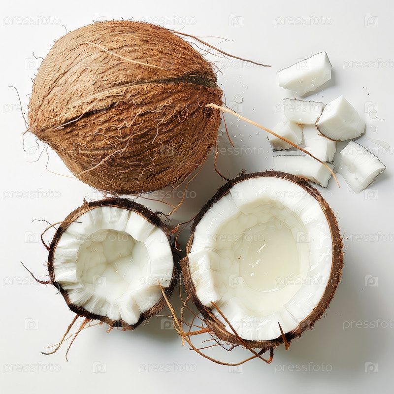 Целые и половинки кокосов на белом фоне