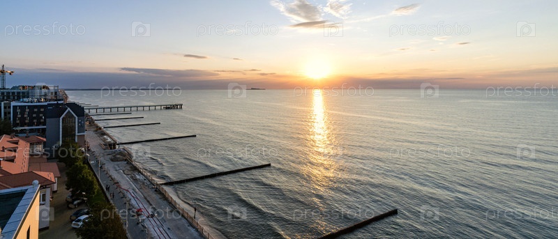 Песчаный пляж на набережной Зеленоградска с видом сверху