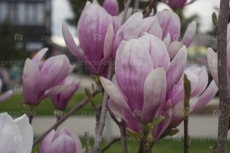 Цветущие цветы магнолии в городском парке весенним днем