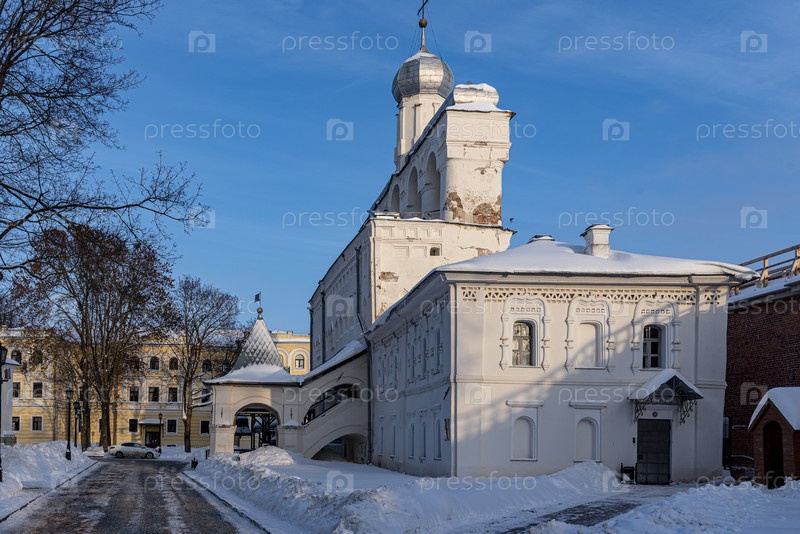 Историческое здание из белого камня на фоне заснеженного пейзажа под голубым небом. Великий Новгород, Россия