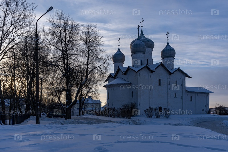 Старая русская православная церковь в зимнем пейзаже на рассвете. Великий Новгород