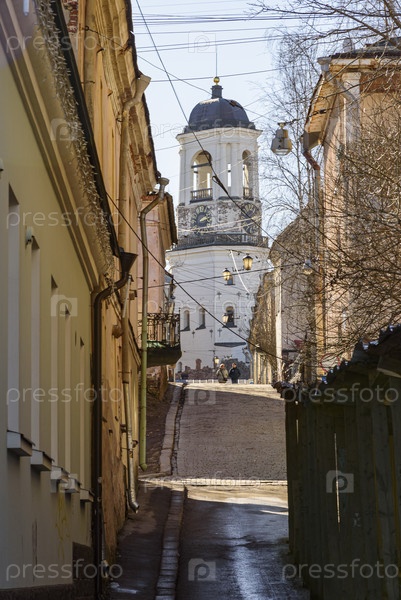 Вид на Часовую башню в Выборге с узкой мощеной улицы в старом центре