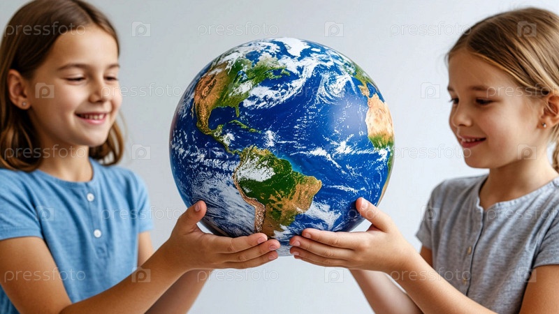 В детских руках макет планеты Земля. Дети держат в руках планету Земля