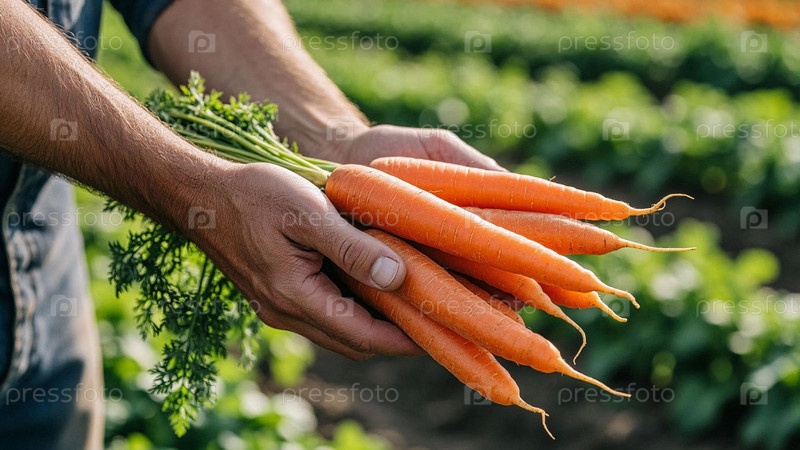 Свежесобранная морковь с грядки в руках садовода. Свежая морковь на фоне грядок на дачном участке. Крупный план рук фермера с пучком выращенной дома моркови. Человек держит только что собранный урожай. Сбор овощей. Органическое земледелие, концепция здоро