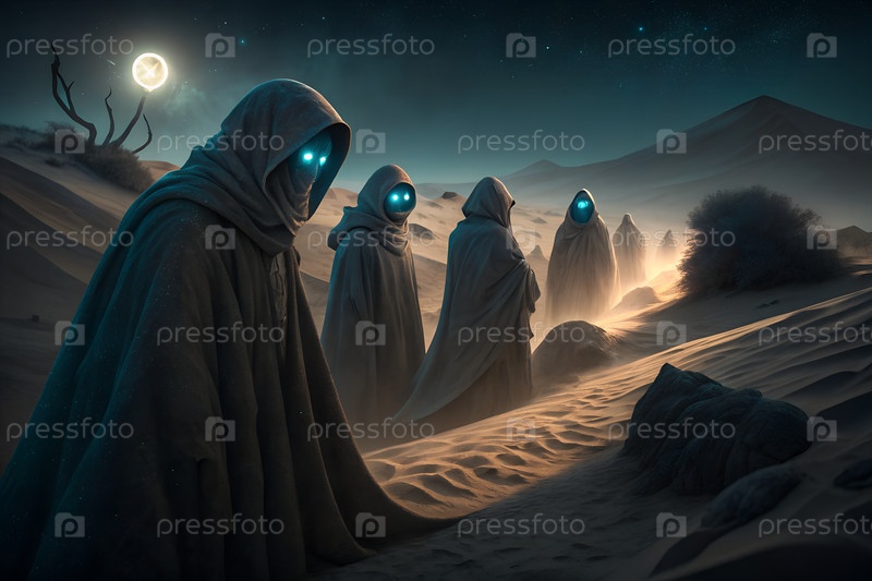 Мистические фигуры с капюшоном, выполняющие ритуал со свечами в сюрреалистическом пустынном пейзаже под сияющим инопланетным небом ночью