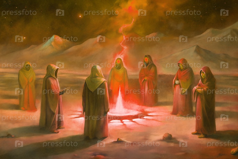 Мистические фигуры с капюшоном, выполняющие ритуал со свечами в сюрреалистическом пустынном пейзаже под сияющим инопланетным небом ночью