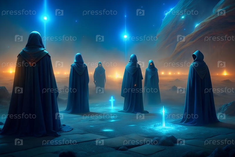 Мистические фигуры с капюшоном, выполняющие ритуал со свечами в сюрреалистическом пустынном пейзаже под сияющим инопланетным небом ночью