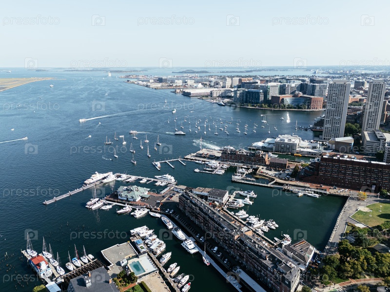 Вид из воздуха на гавань Бостона с парусниками, прибрежным горизонтом и городским пейзажем в солнечный день