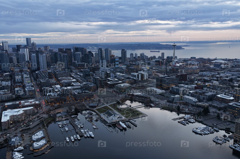 Горизонт центра Сиэтла в синий час с городскими огнями, движением и парком озера Юнион