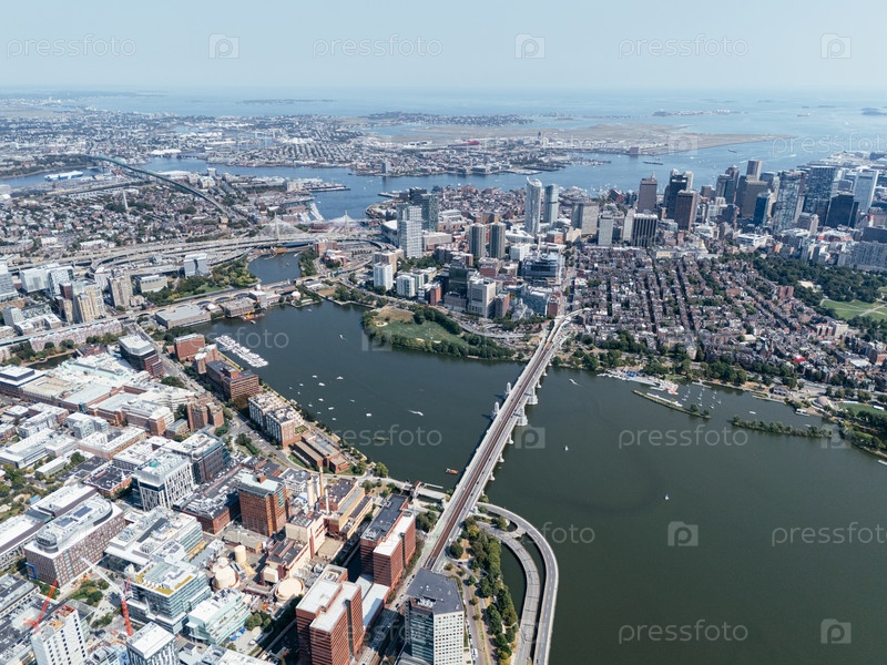 Вид из воздуха на гавань Бостона с парусниками, прибрежным горизонтом и городским пейзажем в солнечный день
