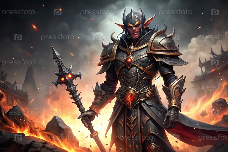 Эпический воин-темный эльф со светящимся волшебным посохом на мистическом поле битвы, кинематографический персонаж фантазии в доспехах. g