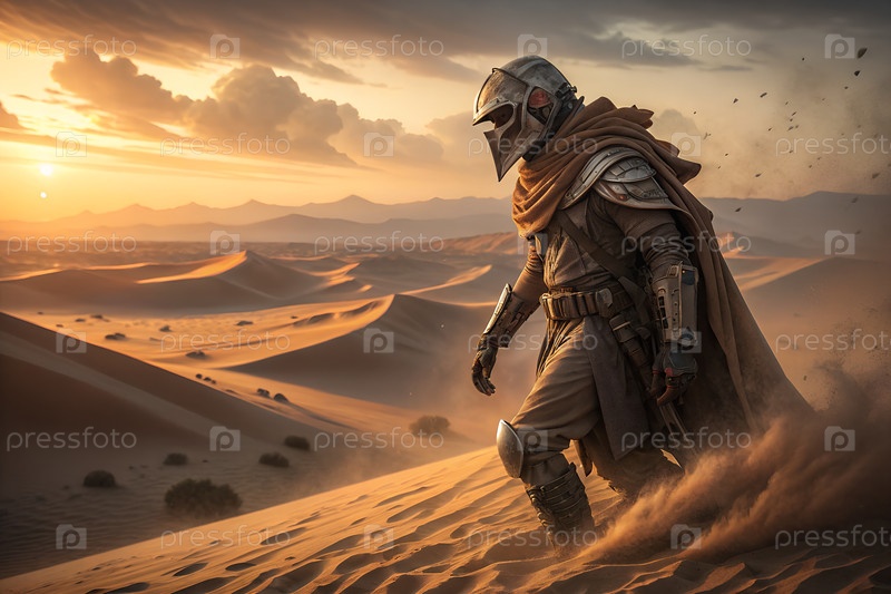 Одинокий футуристический пустынный воин, стоящий на песчаных дюнах в драматическом пейзаже заката солнца, научно-фантастический кочевник, исследующий Сахару