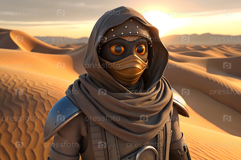 Одинокий футуристический пустынный воин, стоящий на песчаных дюнах в драматическом пейзаже заката солнца, научно-фантастический кочевник, исследующий Сахару