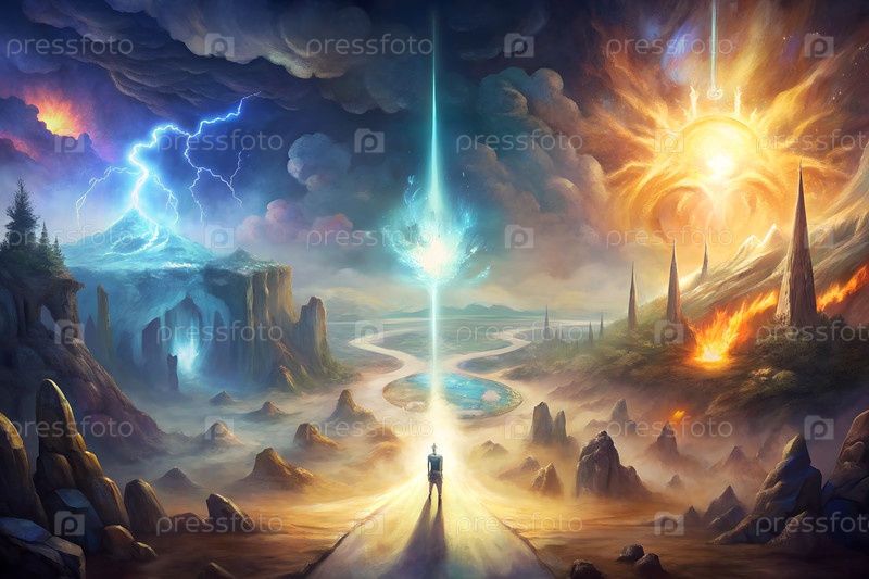 Эпический фэнтезийный пейзаж с молнией, огнем и космическим светом над мистической долиной, когда одинокий герой сталкивается со своей судьбой