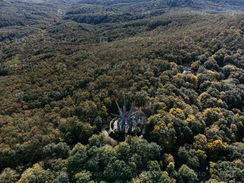 Мемориальный памятник горы Космай на вершине лесистого холма под синим небом, вид с воздуха сербия