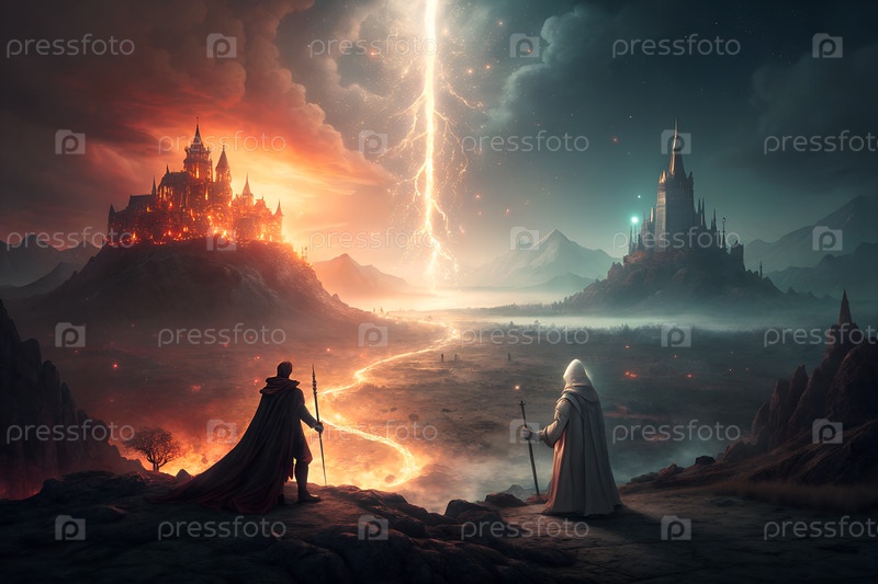 Эпический фэнтезийный пейзаж с молнией, разделяющей два царства, когда волшебники сталкиваются с горящими и замороженными замками в сумерках