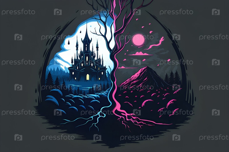 Эпический фэнтезийный пейзаж с молнией, огнем и космическим светом над мистической долиной, когда одинокий герой сталкивается со своей судьбой