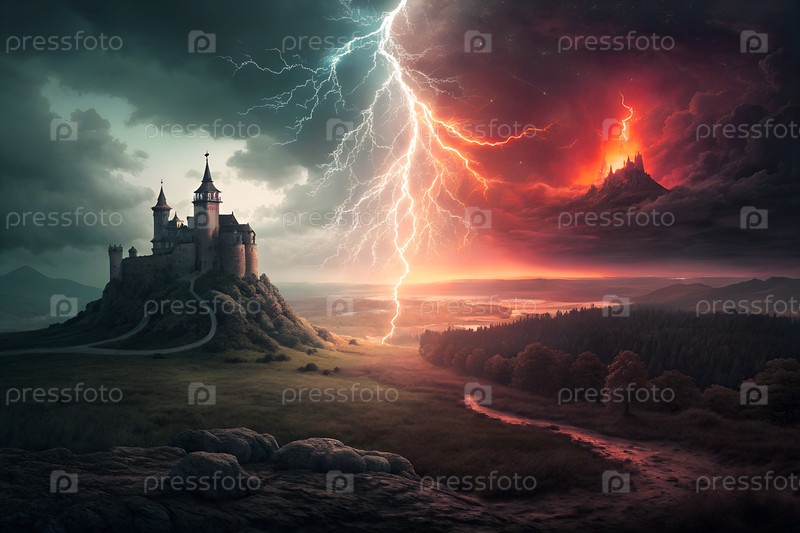 Эпический фэнтезийный пейзаж с молнией, разделяющей два царства, когда волшебники сталкиваются с горящими и замороженными замками в сумерках