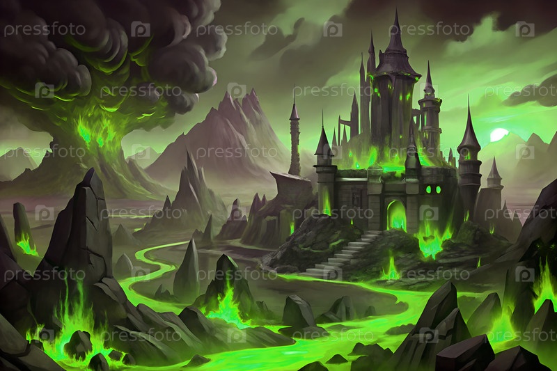Фантастический замок на темном холме с извилистой дорогой, горами и светящимся огнем, драматической пейзажной сценой