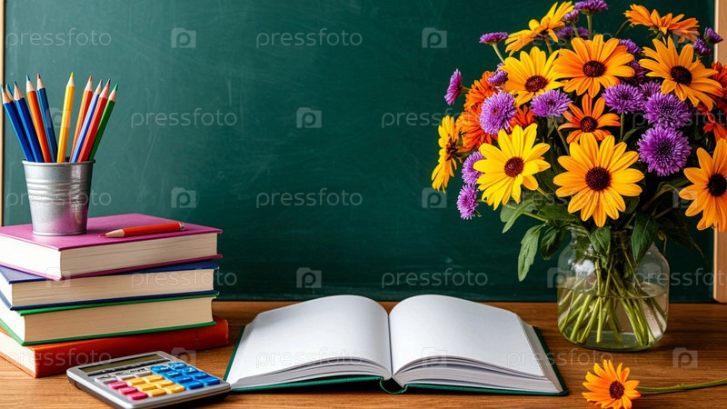 День знаний. Первое сентября. Школьные принадлежности на столе, школьная доска, калькулятор, цветные карандаши и ручки возле классной доски. Натюрморт на фоне школьной доски: букет осенних цветов, учительский стол, школьные принадлежности с калькулятором