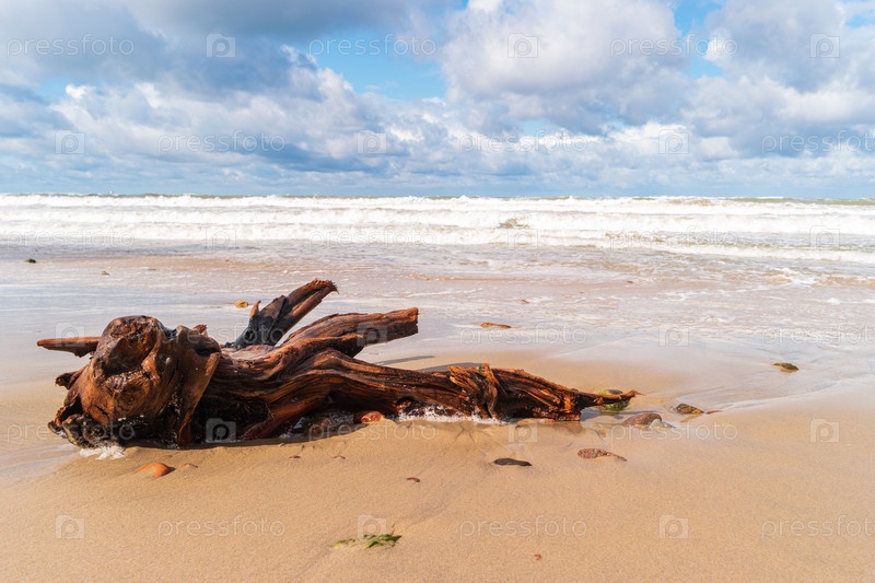 Пейзаж, запечатленный на Куршской косе. Большой, корявый кусок коряги лежит на песчаном пляже. На заднем плане осенние волны Балтийского моря разбиваются о берег. Зеленоградск. Россия