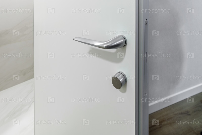 Детальный снимок серебряной дверной ручки без розетки на белой двери. Близкий план скрытого магнитного замка и круглого замочного замка конфиденциальности в современном интерьере. Профессиональные архитектурные детали оборудования с чистым минималистическ