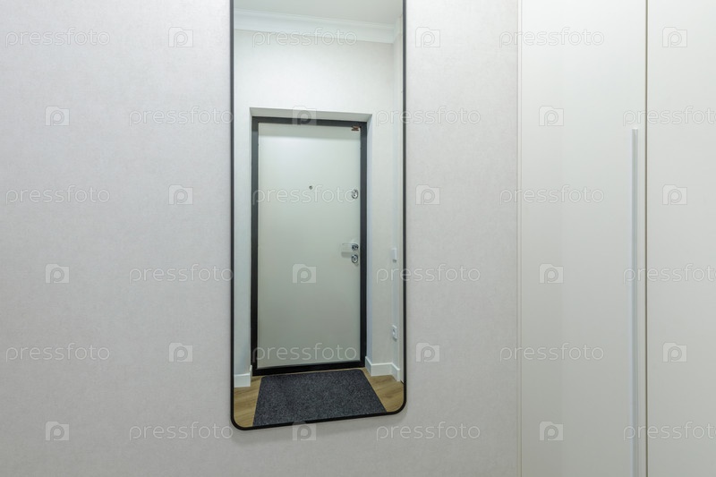 Современный коридор с большим настенным зеркалом, отражающим светло-серую входную дверь с черной рамой.Минималистский интерьер со светлыми текстурами обоев, белым гардеробом и деревянными полами.Чистые архитектурные линии в яркой квартире