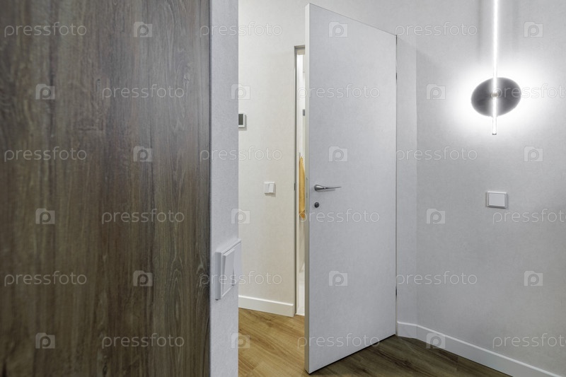 Современный интерьер дома с серой невидимой дверью с ручкой без розетки.Минималистский дизайн со современной стеной, белыми стенами и деревянным полом.Яркое жилое пространство с чистыми архитектурными линиями и стильным освещением