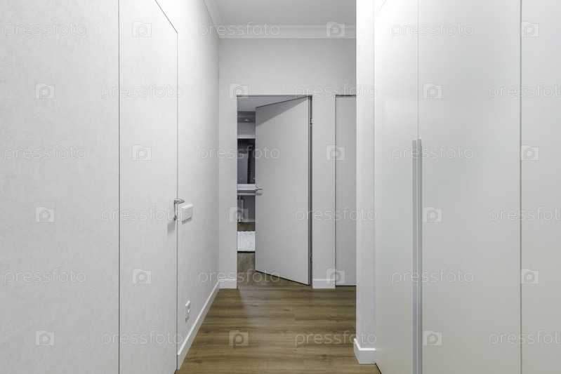 Современный коридор с серыми невидимыми дверями со скрытыми рамками. Минималистский дизайн интерьера с большим белым гардеробом, деревянным ламинированным полом и нейтральными стенами. Яркое жилое пространство с видом на частную комнату