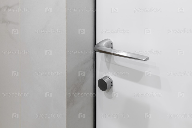 Подробный снимок первоклассной серебряной дверной ручки, установленной без стандартной розетки.Современный минималистический дизайн с белым листом двери, гладким круглым замком и роскошным мраморным отделкой стен.Профессиональные архитектурные детали инте