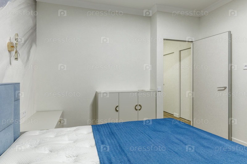 Интерьер спальни с голубыми постельными принадлежностями и минималистическими современными белыми дверями