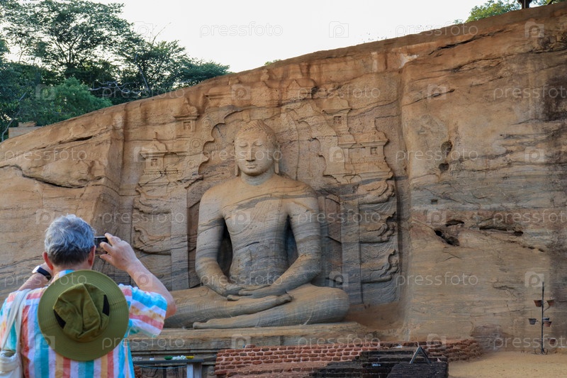 Седовласый мужчина фотографирует статую Будды в храме в Таиланде