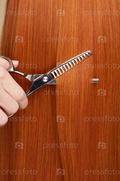Парикмахер режет длинные рыжие волосы ножницами