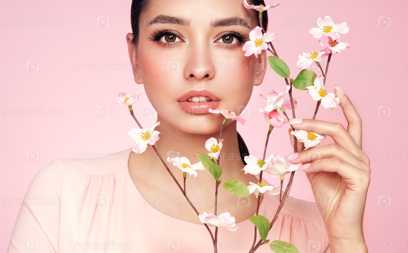 Красивая молодая женщина с ветвью вишневого цветка