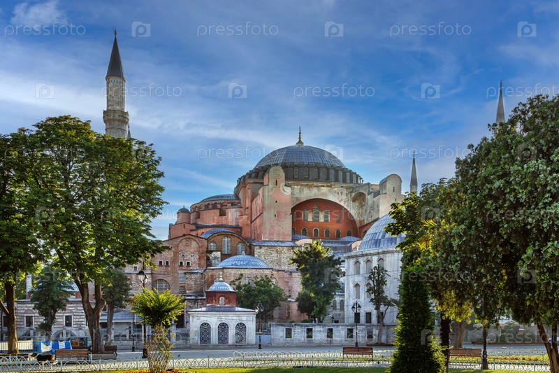 Вид на мечеть Святой Софии со площади Султанахмета в Стамбуле, Турция.Византийская архитектура с куполами под солнечным голубым небом