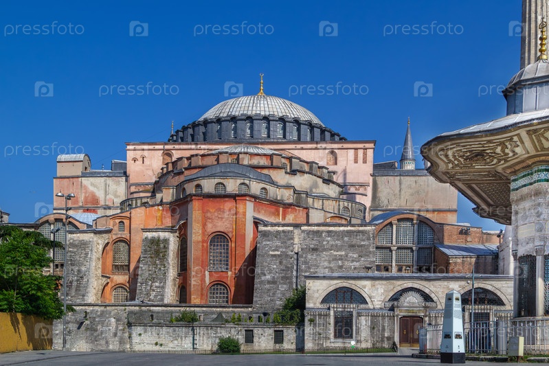 Боковой вид Святой Софии с куполами и опорами в Стамбуле, Турция.Византийская архитектура под солнечным голубым небом