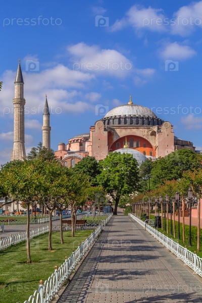 Вид на мечеть Святой Софии со площади Султанахмета в Стамбуле, Турция.Византийская архитектура с куполами под солнечным голубым небом
