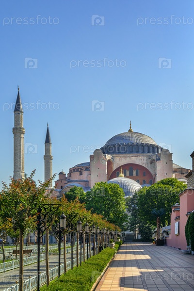 Вид на мечеть Святой Софии со площади Султанахмета в Стамбуле, Турция.Византийская архитектура с куполами под солнечным голубым небом