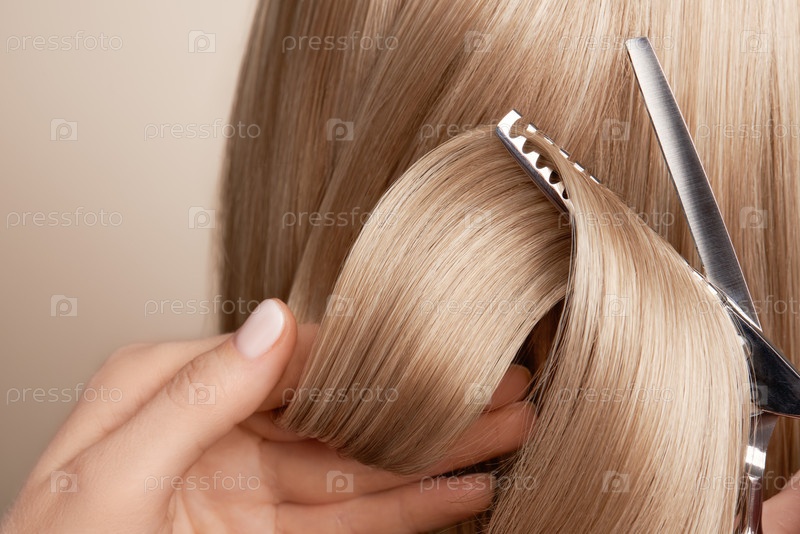 Парикмахерская режет длинные блондинки ножницами